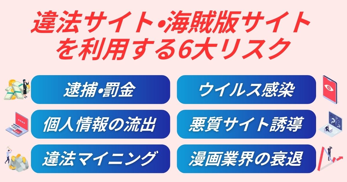 また、個人情報の漂洩や不正な広告による詐欺被害に遭うケースも報告されており、無料で読めるというメリット以上にデメリットの方が大きいのが実情です…